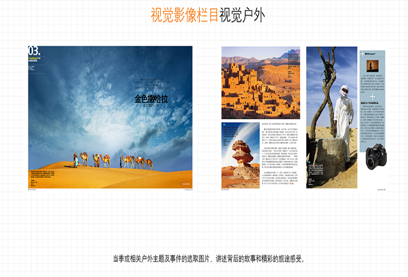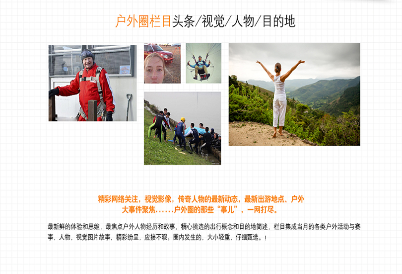 《户外装备》主要栏目:头条、视觉、大玩家、发烧友、日记、目的地、装备栏目、酷品、玩家推荐、体验解析、训练营、特写、驾驭、寰宇地理、品牌装备。